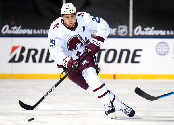 STATELINE, NEVADA – FEBRUARY 20: Nathan MacKinnon #29 of the Colorado Avalanche skates with the puck against the Vegas Golden Knights during the second period of the 2021 Bridgestone NHL Outdoors Saturday on the 18th fairway of the Edgewood Tahoe Resort, at the south shore of Lake Tahoe on February 20, 2021 in Stateline, Nevada. (Photo by Brian Babineau/NHLI via Getty Images)